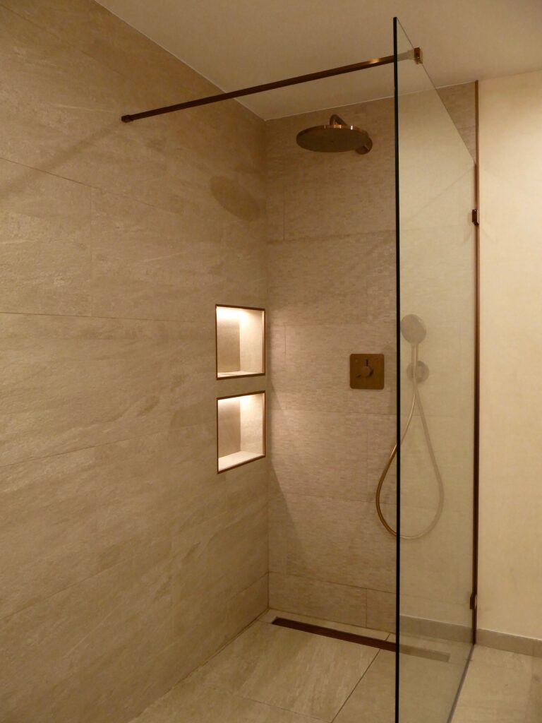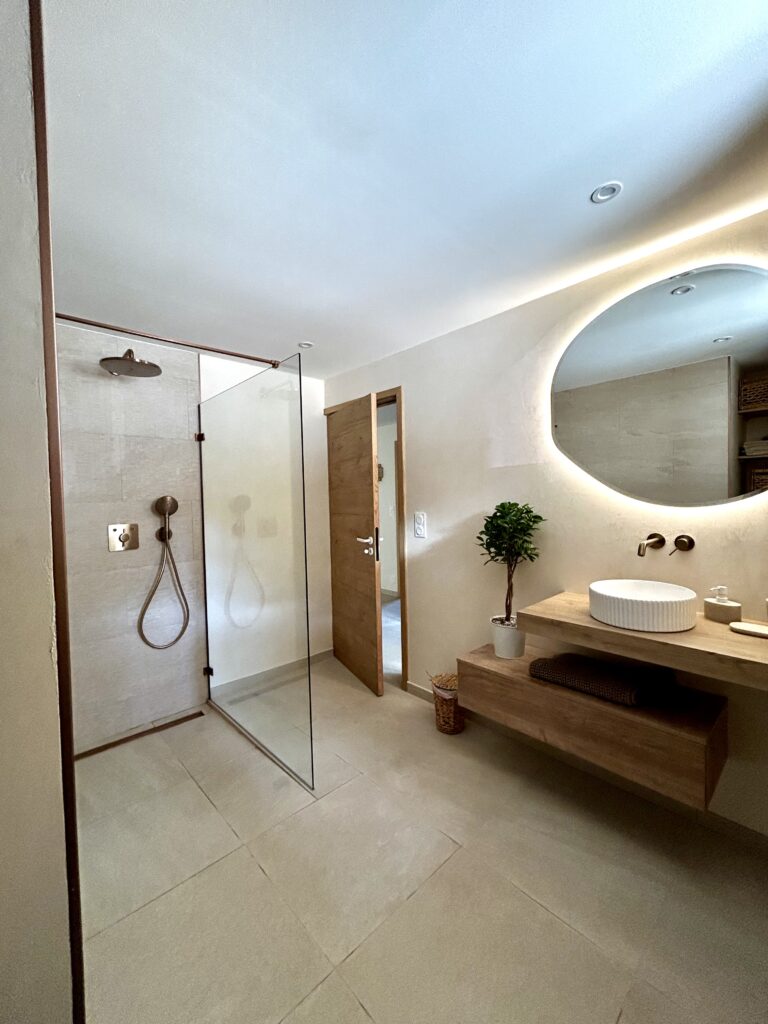 🛁 Une très grande salle de bain avec des matériaux naturels et les touches de décoration raffinées. Grande douche italienne, vasque, lave linge, sèche cheveux, sèche serviette